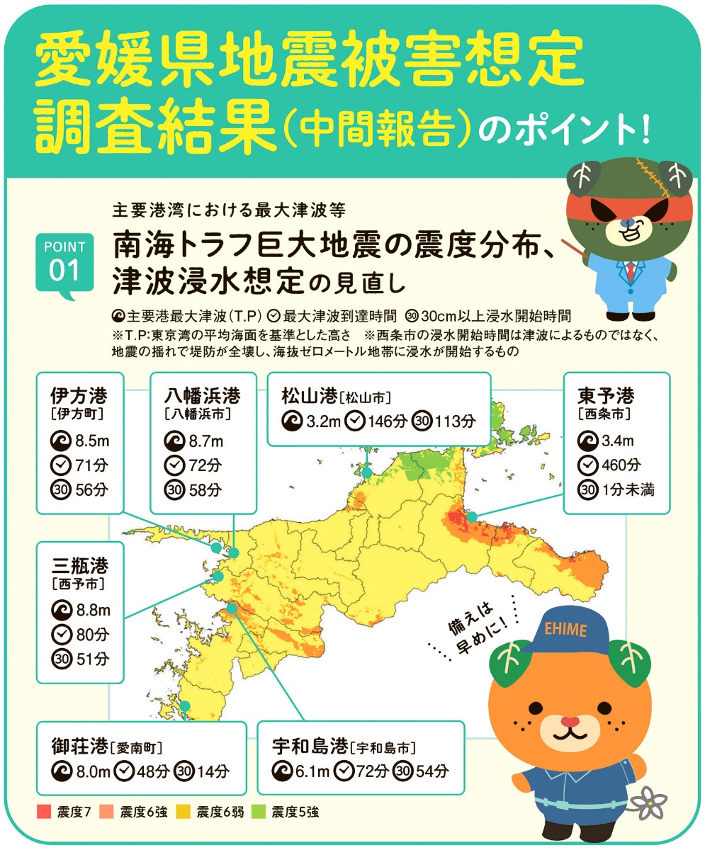 「愛媛県地震被害想定調査」とは、南海トラフ巨大地震をはじめとする愛媛県に大きな影響を及ぼす地震による被害を想定するために、県が独自に実施している調査です。前回調査から10年以上が経過したことや、国の南海トラフ巨大地震の被害想定が見直されたことを踏まえ、最新の知見およびデータを反映のうえ見直しを行い、9月に中間報告を発表しました。今回は、被害想定の前段となる自然現象(地震動・津波等)の想定をとりまとめたものです。