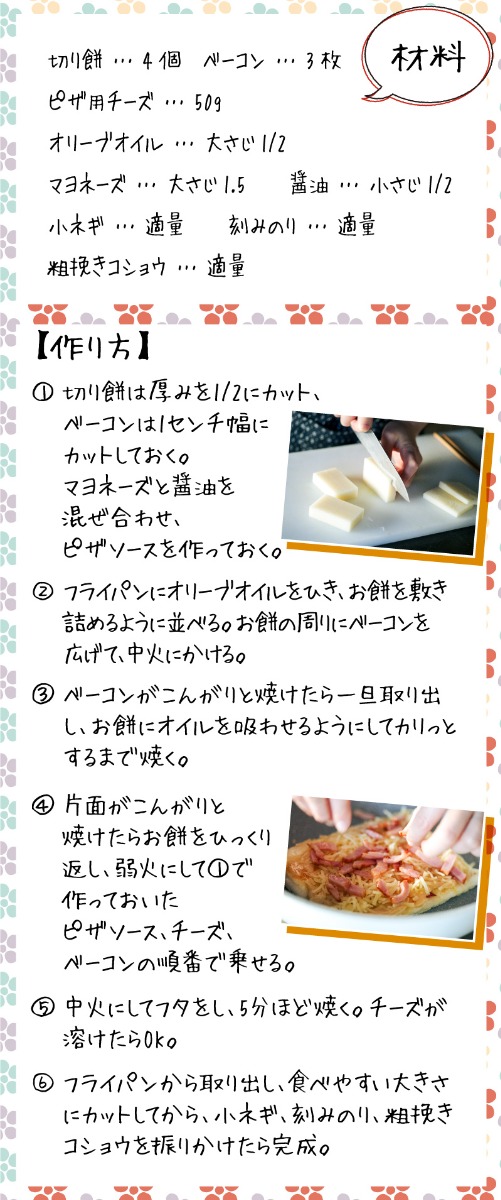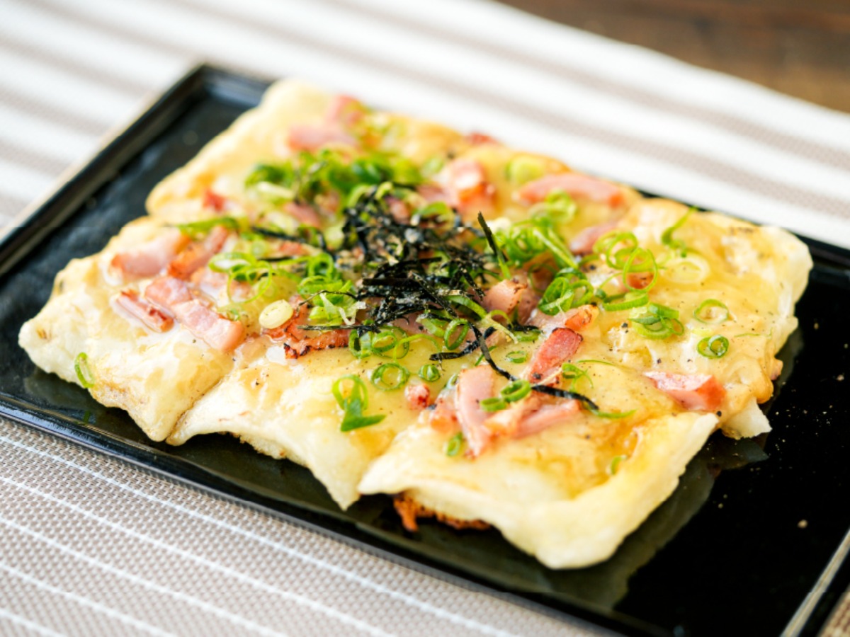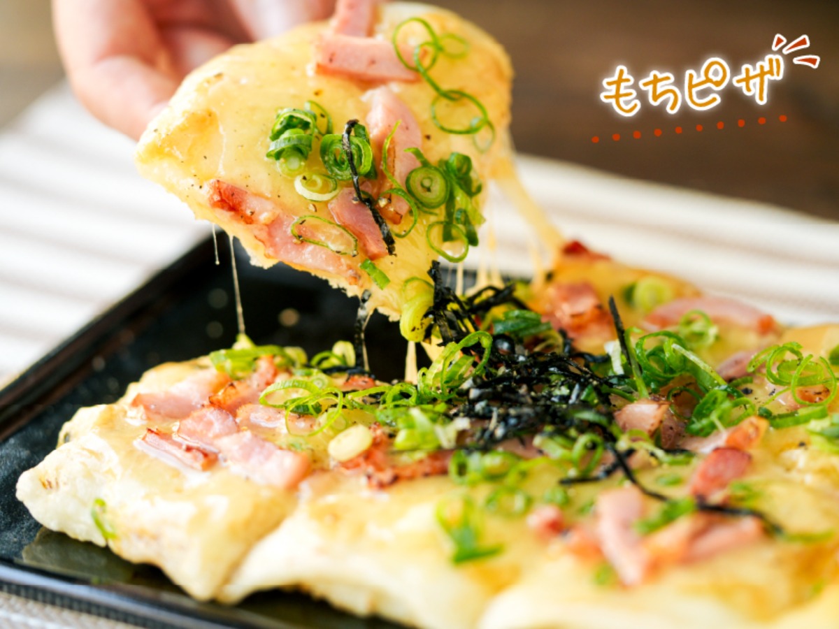 和風のソースに、チーズ、ベーコンのコクと塩味がベストマッチ。通常のピザ生地以上に食べ応えもありますので、小腹が空いた時だけでなく食事にもなります。熱いうちにどうぞ。