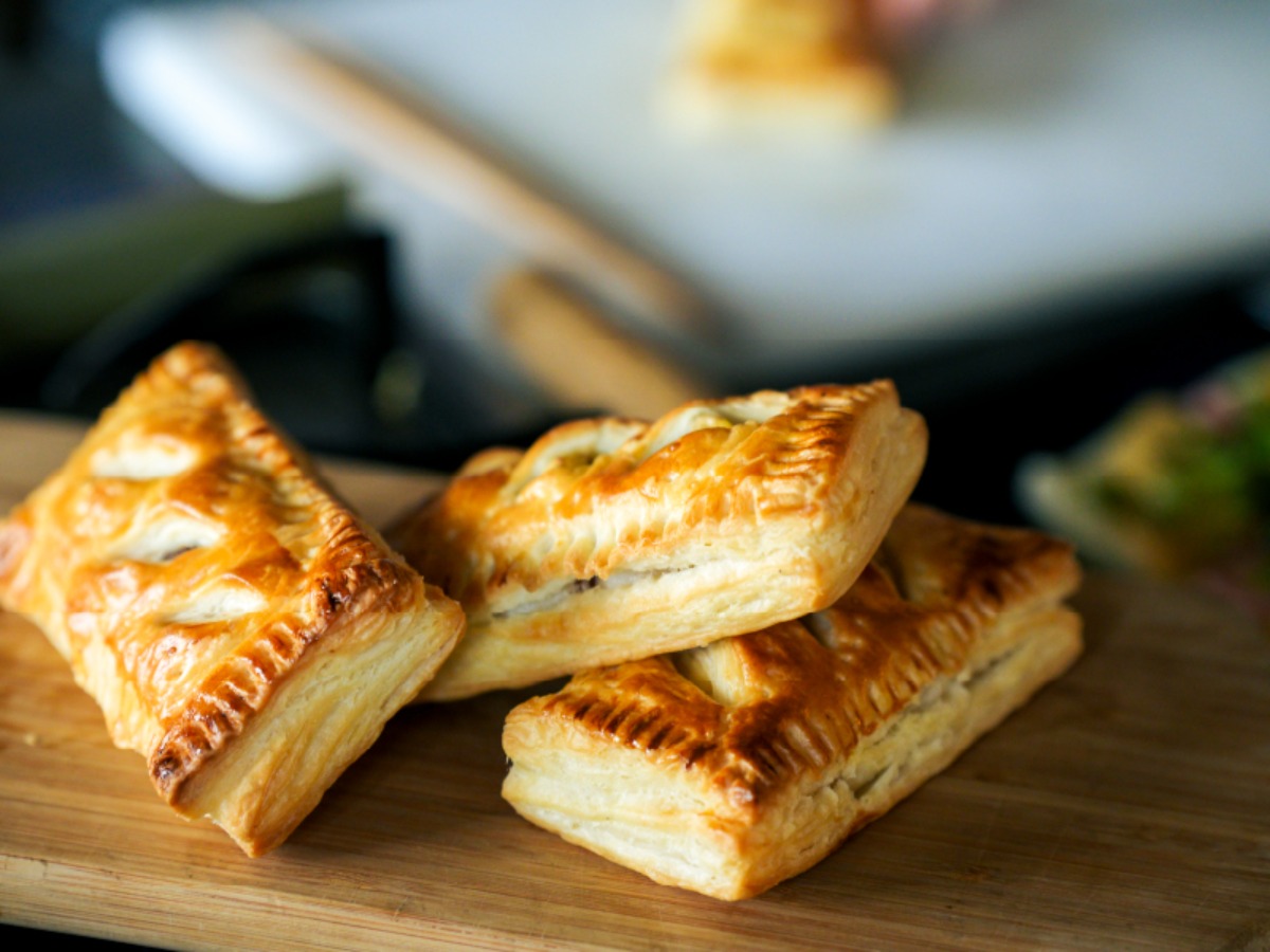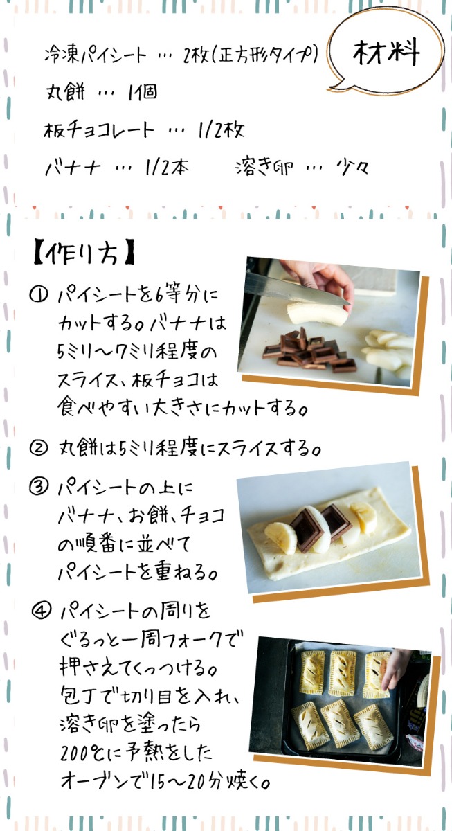 サクッと軽いパイの焼き立て食感と、中から溶け出すチョコレート&お餅が至福の食感。バナナの優しい香りも相まって、いくつでも食べられそうな美味しさです。お好みでチョコレートの量を増やしても。冷めるとしっとり食感に変わり、違った味わいが楽しめますよ♪