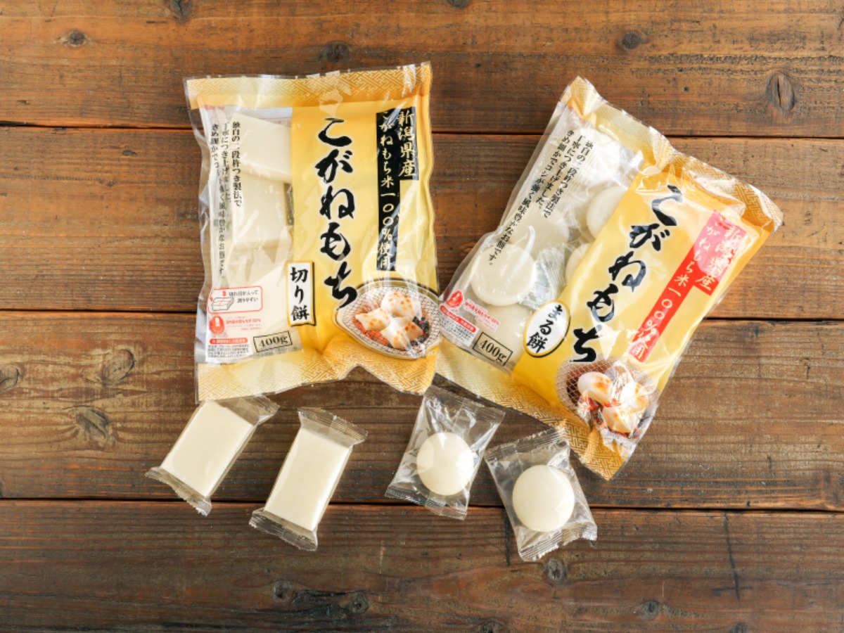 四角くカットしたタイプ、ころんとした丸餅タイプで販売しているお餅。個包装になっているので、鮮度が長持ちして保存食としても重宝します。フジおすすめの「新潟県産こがねもち」は新潟県産こがねもち米を100%使用 していて、きめ細かでコシが強く、風味豊かなお餅になっています。