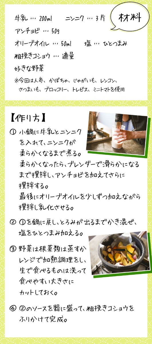 オーブンに入れている間に、ささっとバーニャカウダを作ることができる今回のメニュー2品。簡単なのに、見た目も味わいもとっても本格的なので、今年のクリスマスのメニューに迷っている方はぜひ作ってみて。