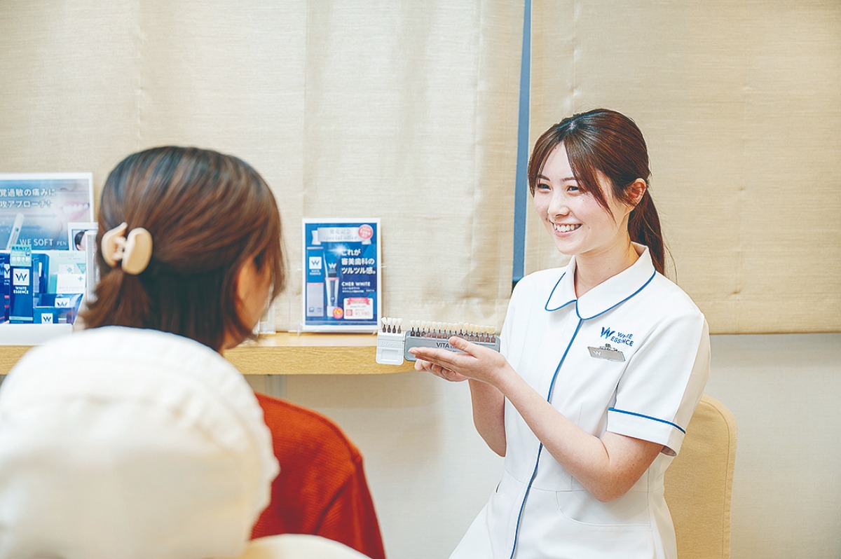 施術ではデジタル機器で歯の色を測定し、希望する白さに応じて一人ひとりに合ったプランを提案。また返金保証制度を備えたコースもあり患者にとって安心感が大きいのも魅力。