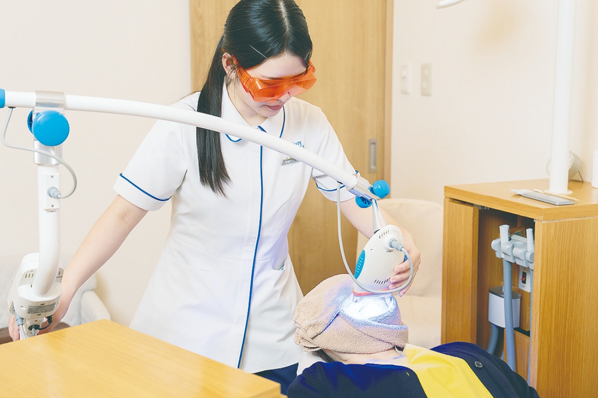 まずは丁寧なクリーニングで歯の持つ本来の白さを引き出す。ホワイトニング前にホワイトニング剤の浸透を妨げる汚れを取り除くことで施術効果もより高まり、虫歯や歯周病予防にも繋がるという。