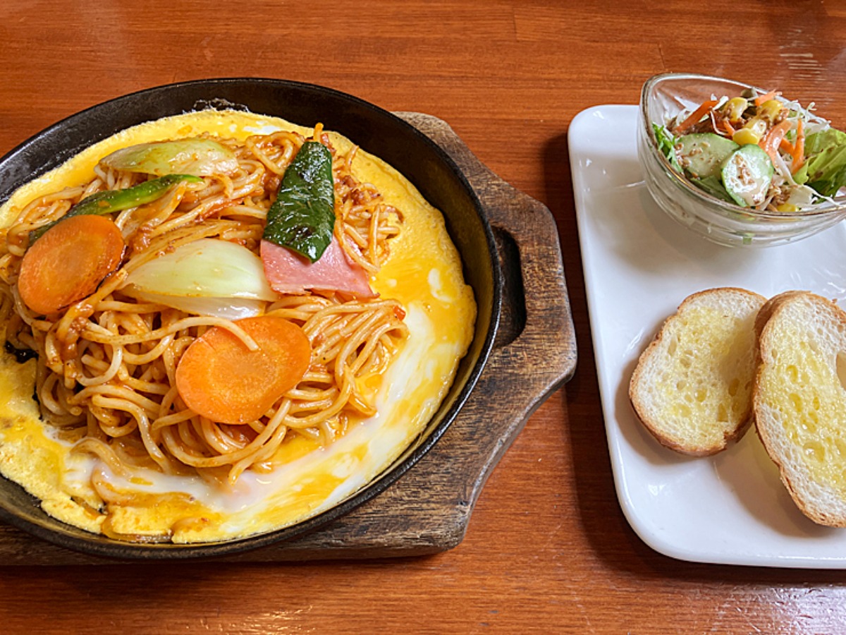 しばらくすると、サラダにパン、熱々の鉄板ナポリタンが運ばれてきました。