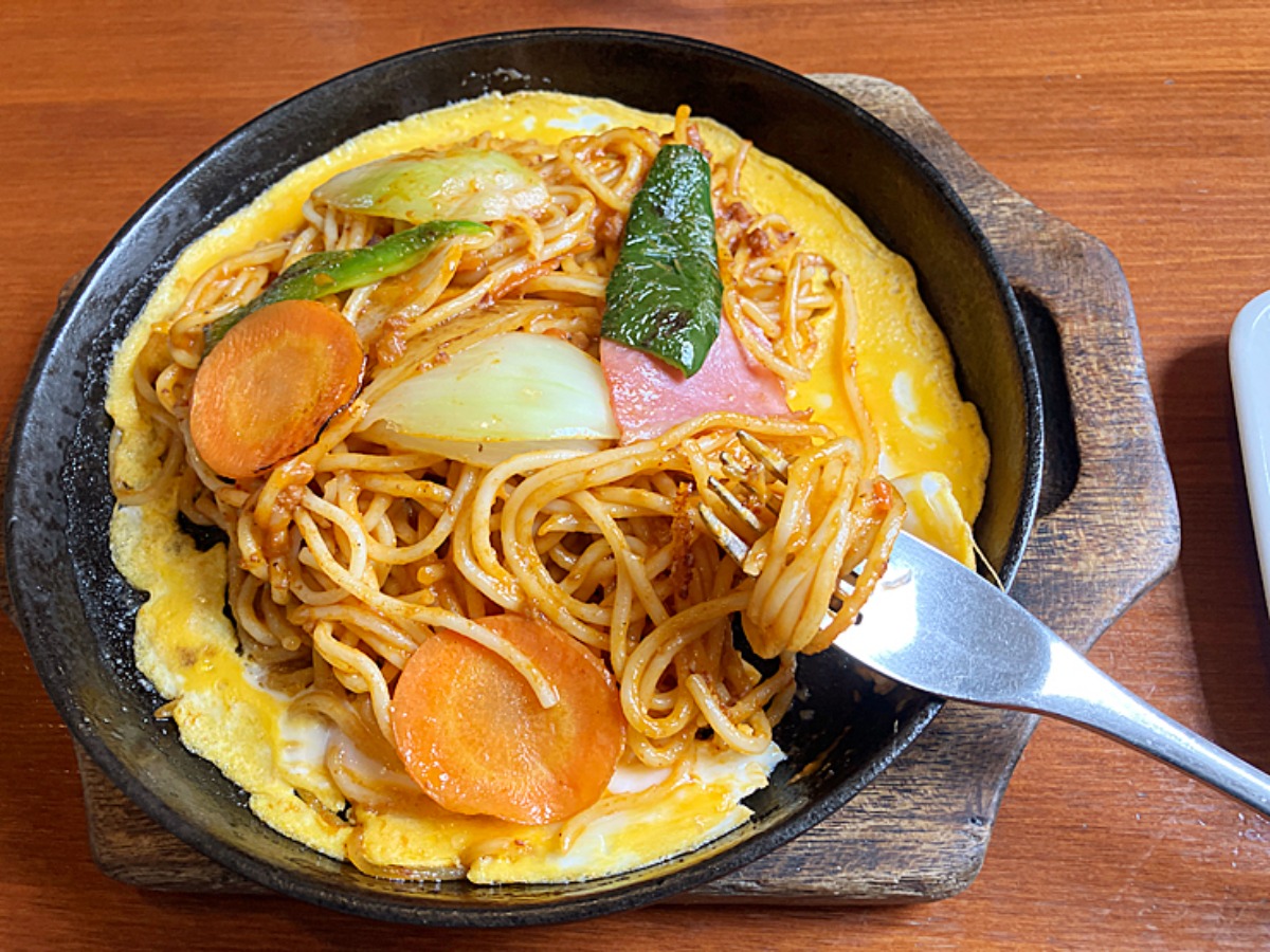 「鉄板ナポリタン」は、熱々の鉄板皿で提供され、たまごを具材としているナポリタンです。