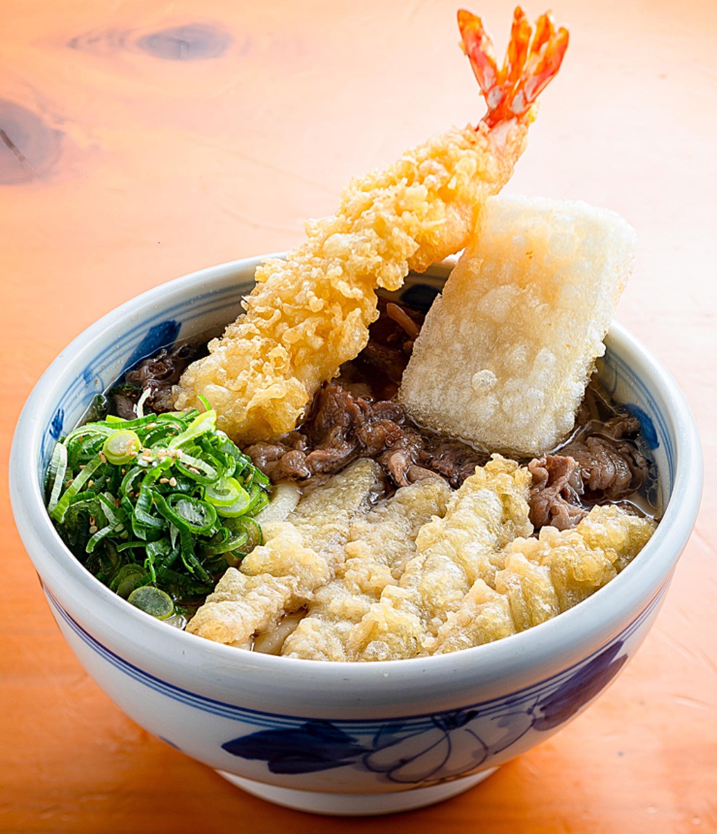 明治38年創業の「田中屋」の天然醤油で下味を付けた、熱々ジューシーな鶏天を5つもトッピングした大満足メニュー