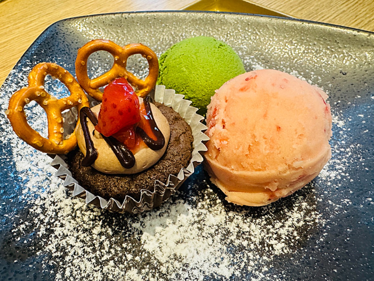 いちごソルベ+抹茶アイスの2種類が添えられ、チョコとの相性も抜群。