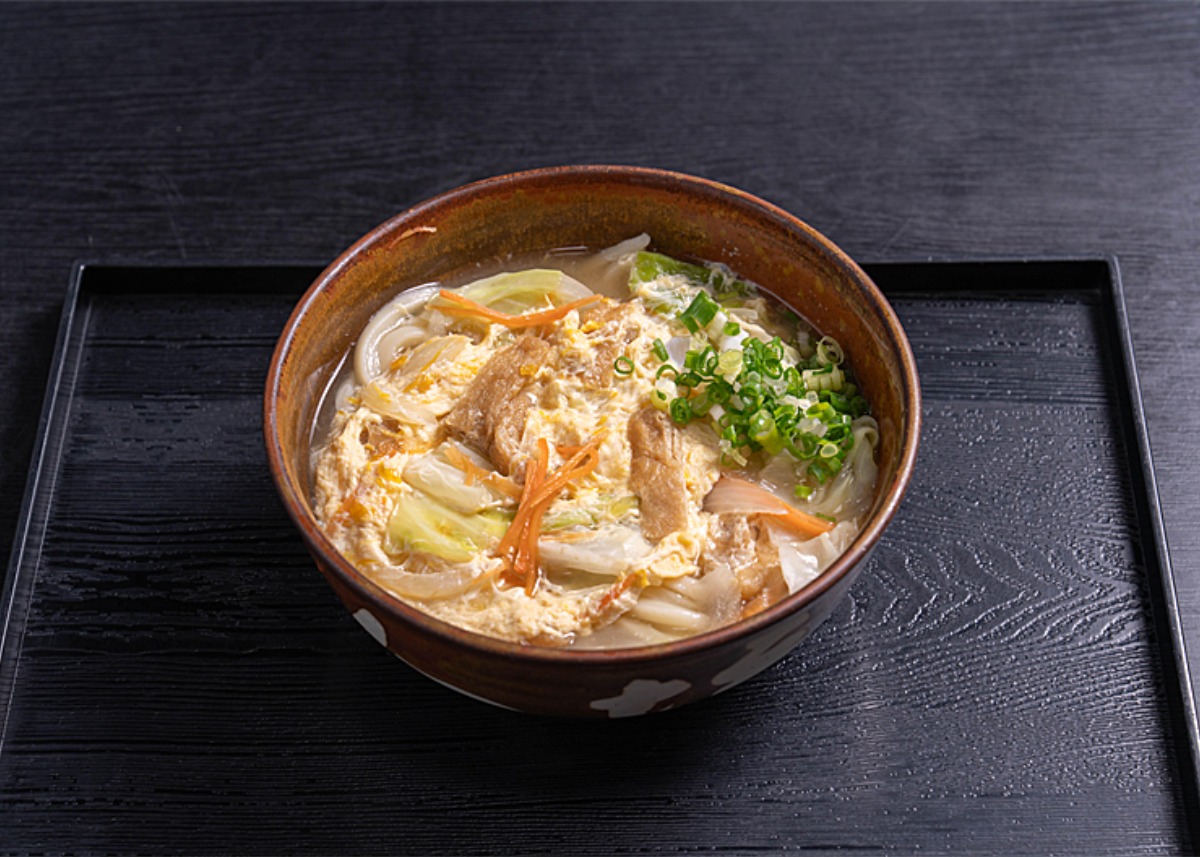 かけうどんの上に、ふわっと卵でとじた野菜。優しい甘さが老若男女に愛される一杯