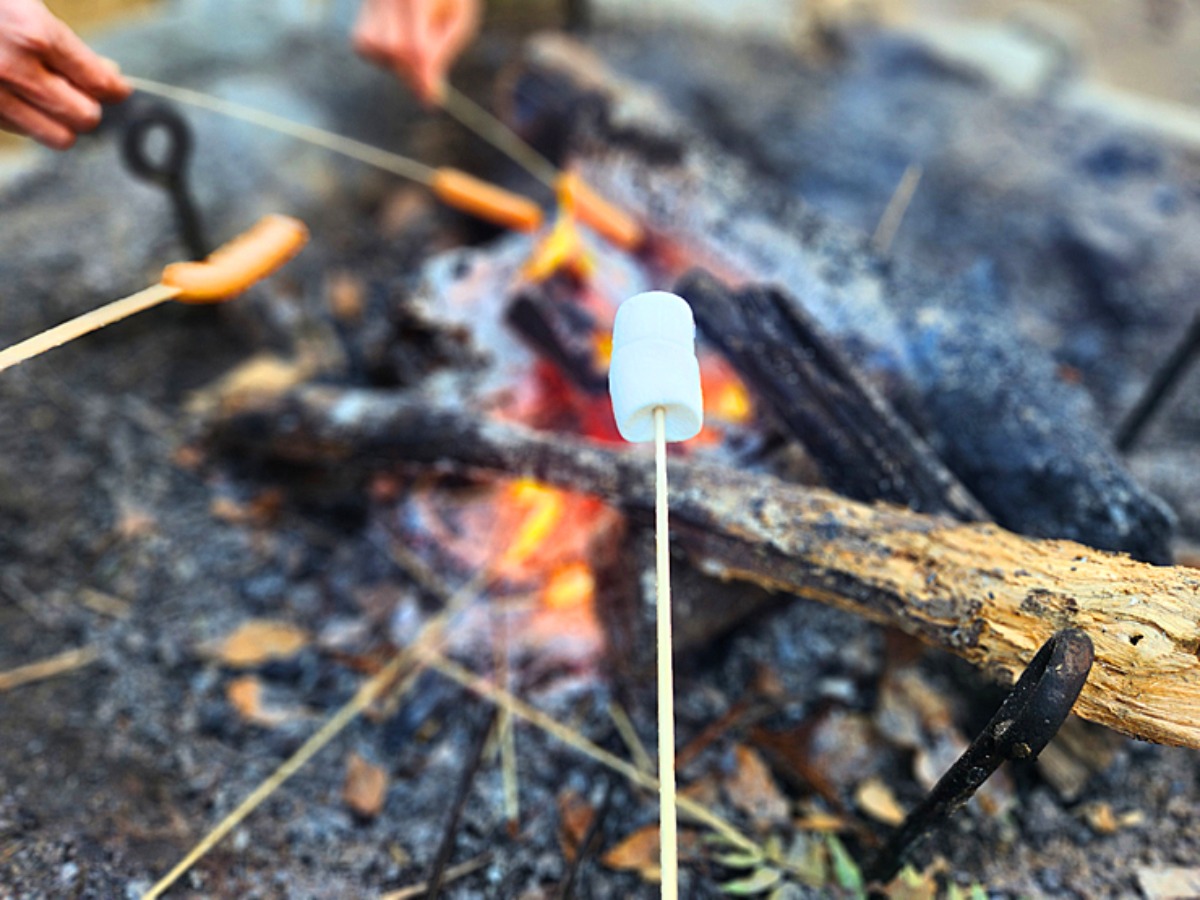 焚き火ではマシュマロとウインナーを焼くことができ、1つ50円で販売。