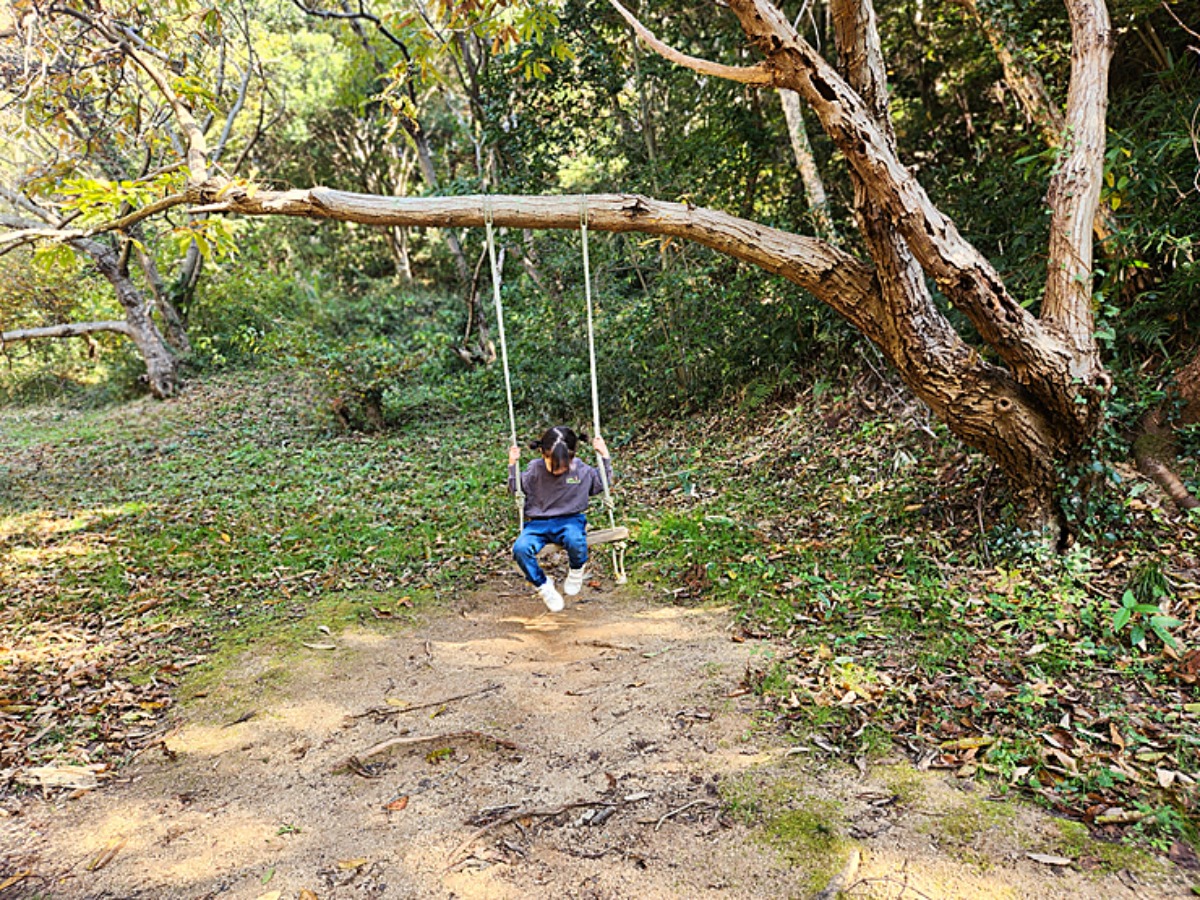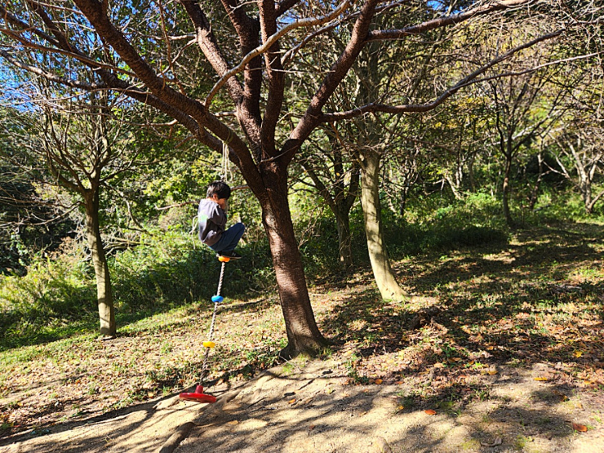 さらに奥へと進むと、木でできた遊具やブランコ、ちょっとした木登りスペースが。