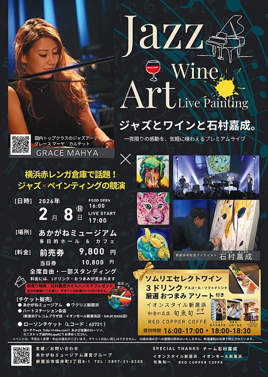 イベントの最大の魅力は、国内トップクラスのジャズピアニスト・グレース・マーヤと、新居浜出身のアーティスト石村嘉成による夢のコラボレーション!