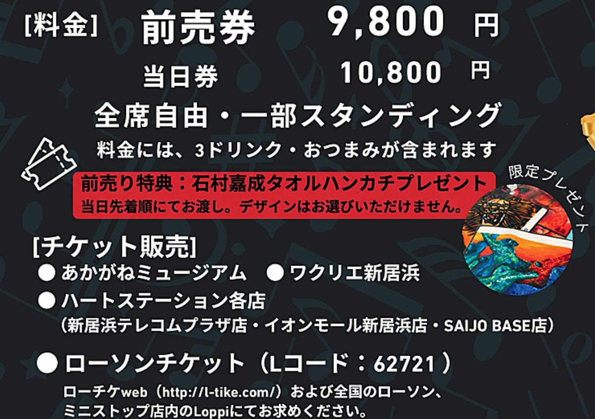 前売り券は9,800円で、当日券よりも1,000円お得な上、購入特典として「石村嘉成オリジナルタオルハンカチ」がもらえるのも嬉しいポイント!