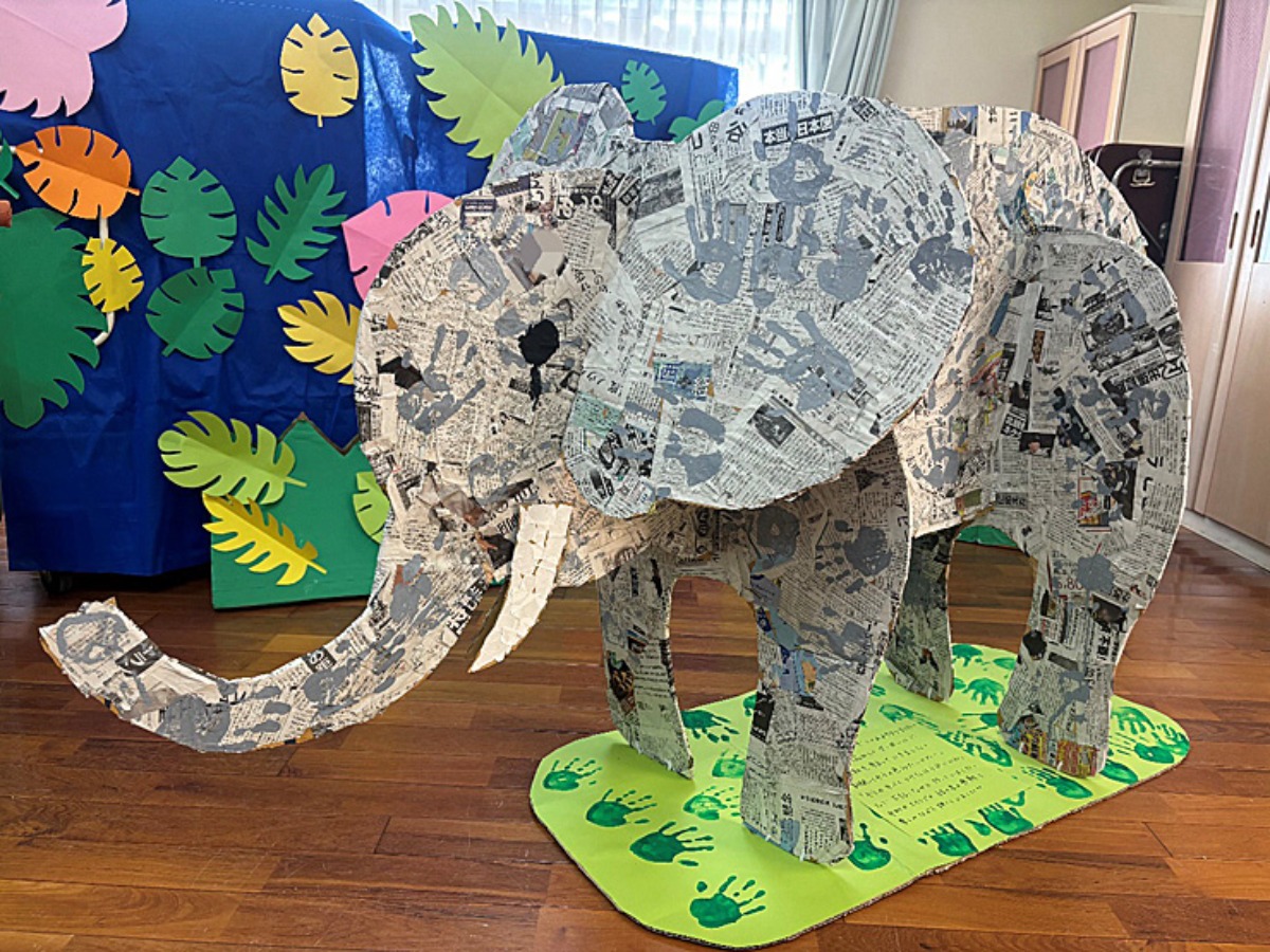 画用紙や毛糸でできた木々やツル、カラフルな動物たち、鮮やかな葉っぱがあちこちに飾られ、ホール全体が楽しい冒険の世界に大変身しました。
