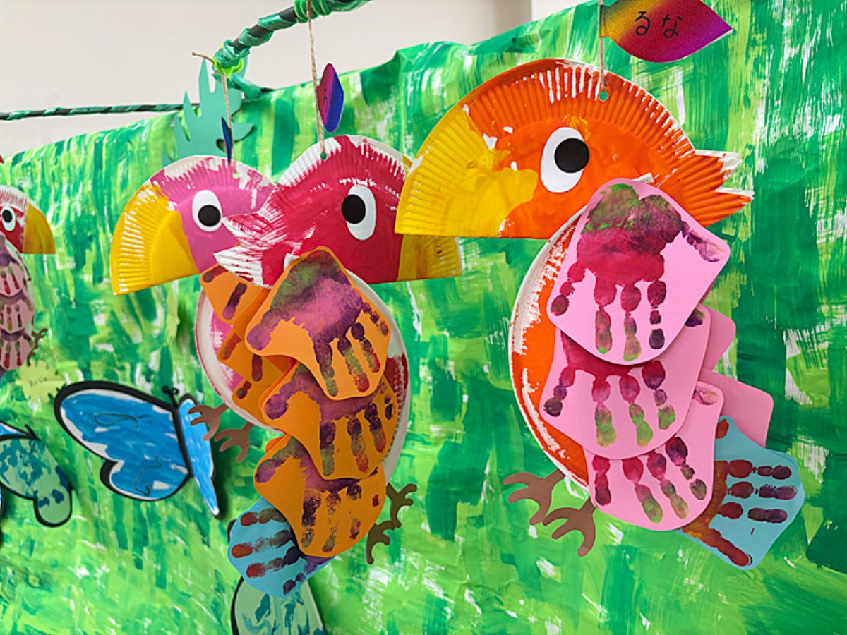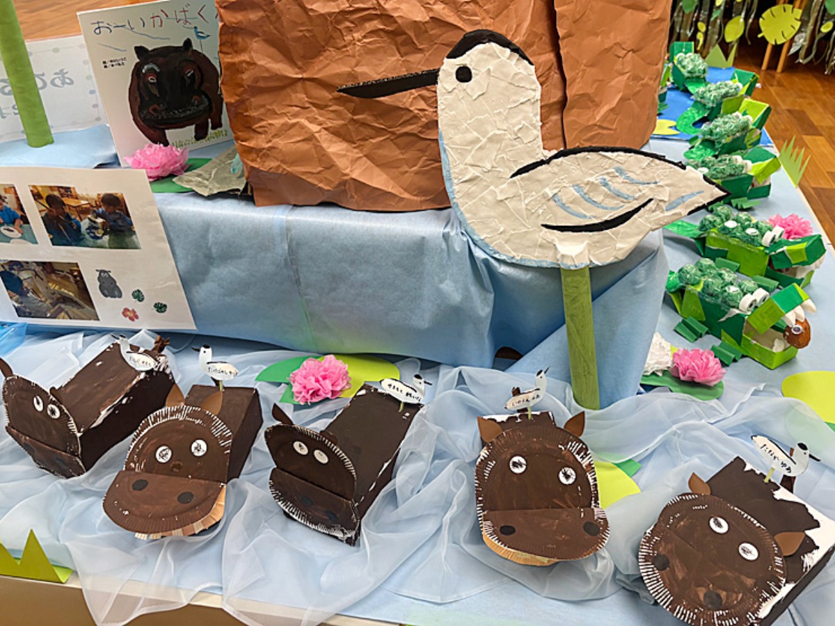 手形を活かしたり、お気に入りの絵本からアイデアを取り入れたり、一生懸命つくったあたたかさが伝わります。