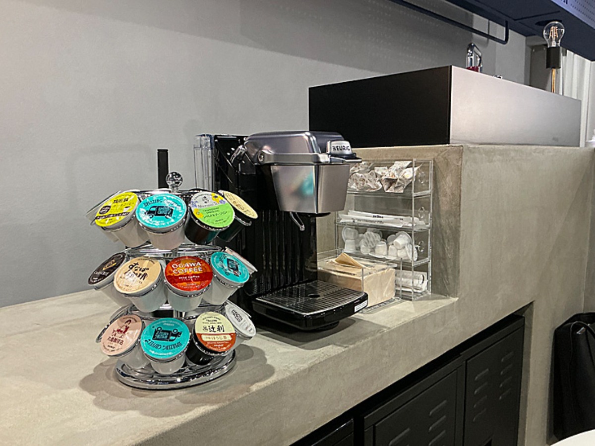 セルフのドリンクマシンで好きな飲み物を楽しめるほか、冷蔵ショーケースにはジュースも完備。
