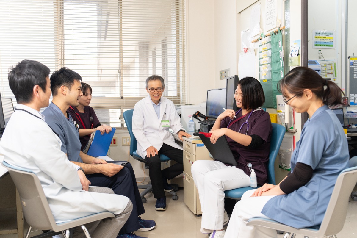 医師・看護・リハビリ・栄養・薬剤・MSWが密に連携。患者の状態を多角的に把握でき、より良いケアにつながる相談がその場でできる。