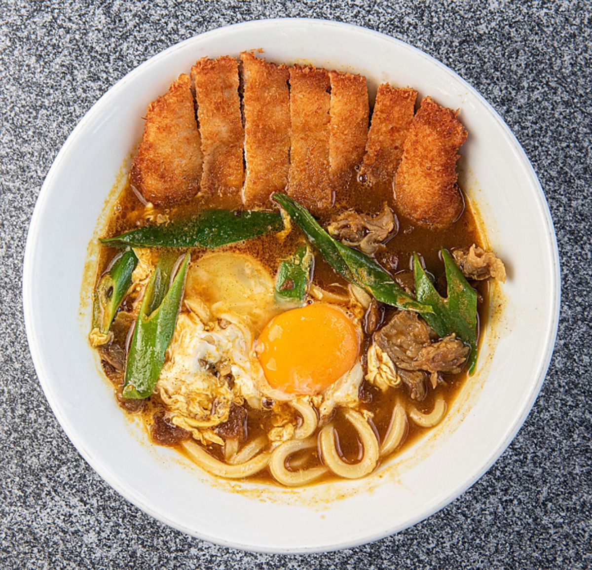人気No.1「だし入りカレー」に、とんかつをトッピングした贅沢な一杯。肉、卵入りのとろみのあるカレーつゆと、揚げたてサクサクのとんかつが相性◎