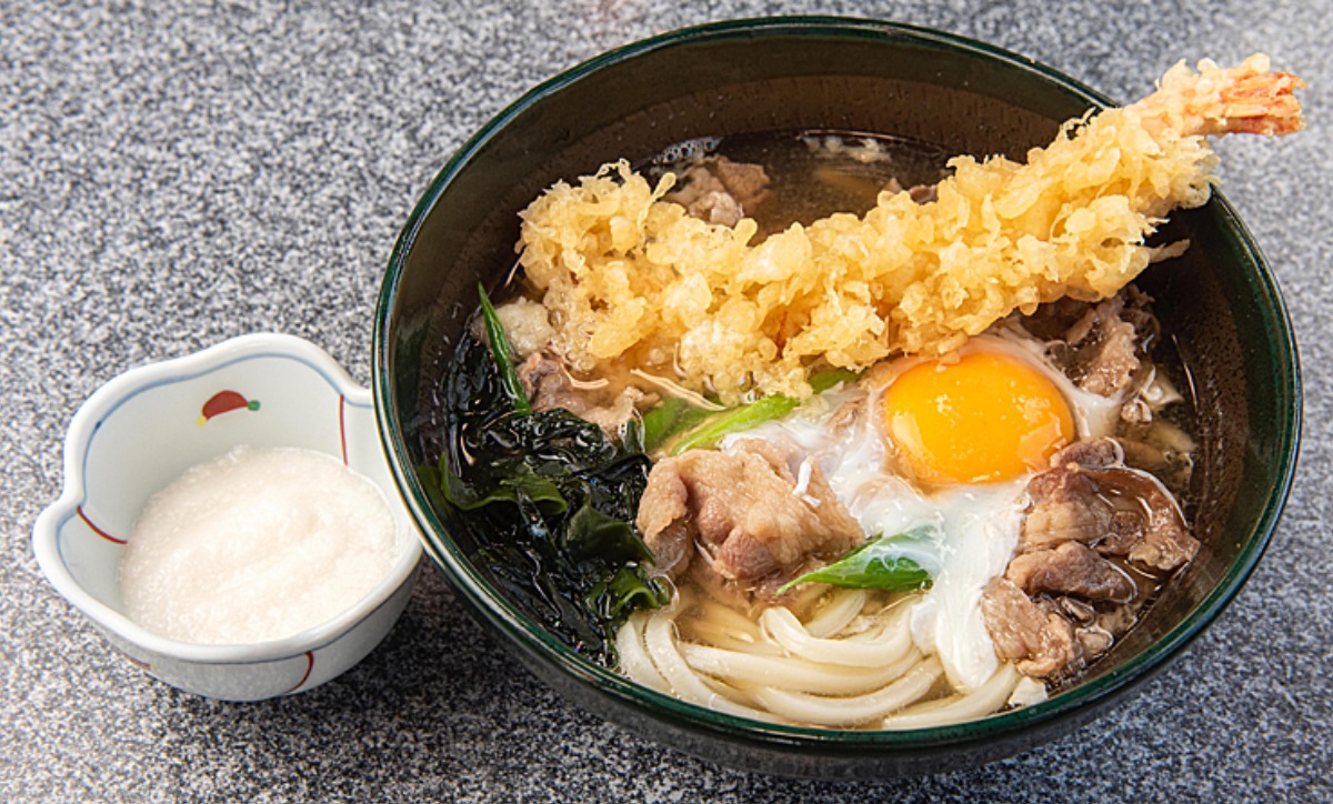 天ぷら、肉、卵と、別添えの山芋おろしを混ぜて食べる、スタミナたっぷりのうどん。食欲をそそられる、トロッとした食感が人気
