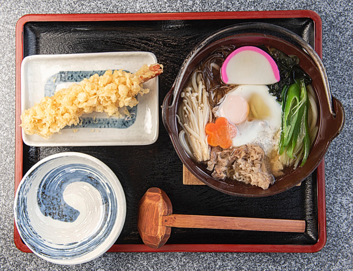 うどんと具材を鍋ごと煮込むあつあつの鍋焼きうどんは、秋冬に人気。注文後に揚げるサクサクの海老天をトッピングしてどうぞ