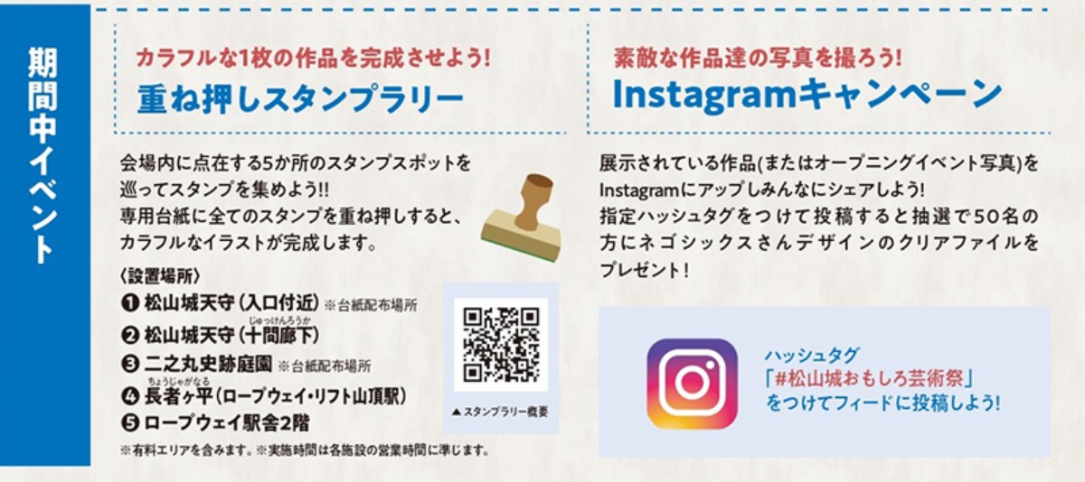 さらに、展示作品の写真をInstagramに指定ハッシュタグ「#松山城おもしろ芸術祭」を付けて投稿すると、抽選で50名にネゴシックスさんデザインのクリアファイルが当たるプレゼントキャンペーンにも参加できます。