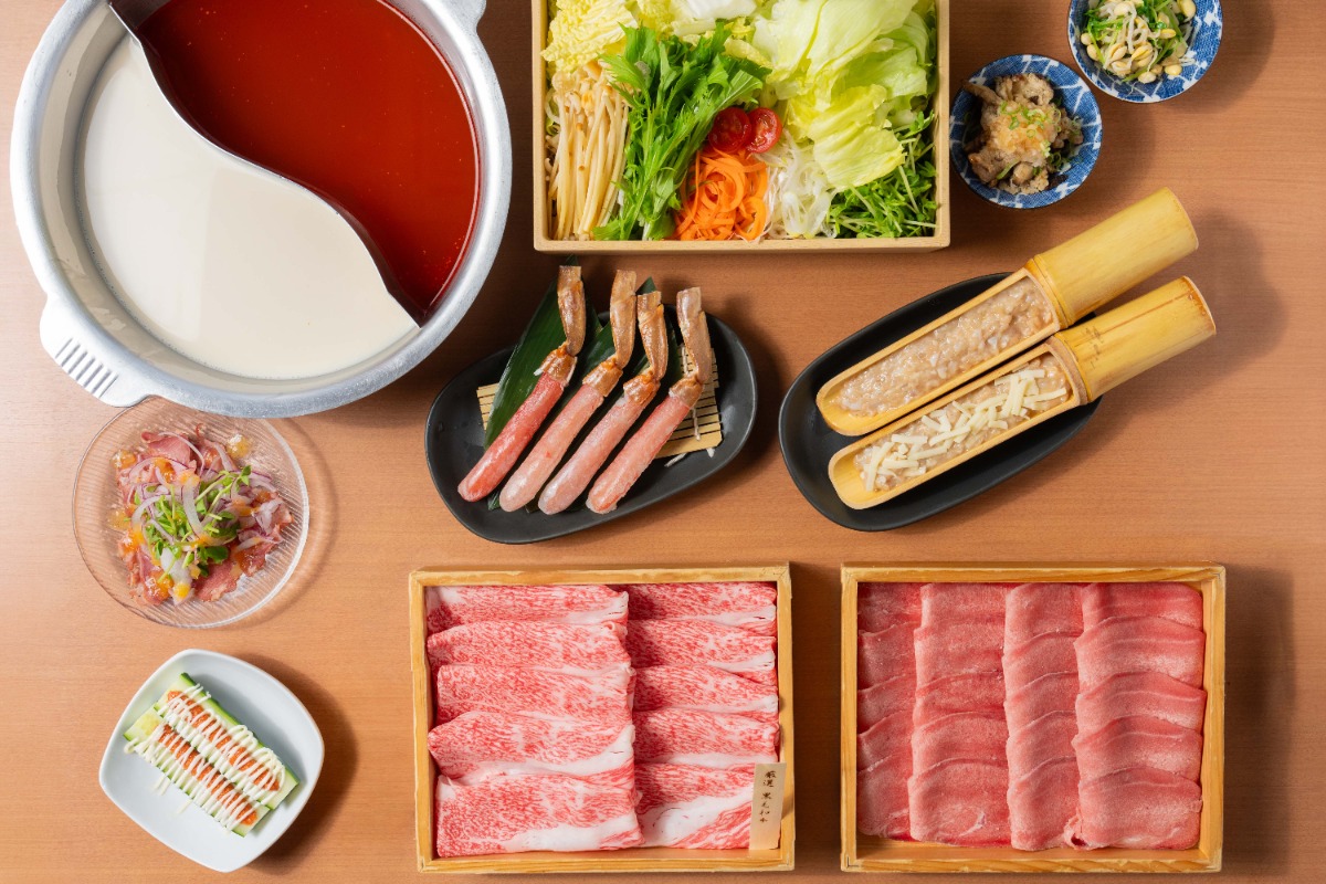 ボリューム重視の人も、黒毛和牛をじっくり味わいたい人も満足できる、選べるコースが魅力。高品質な食材と風味豊かなダシで楽しむしゃぶしゃぶは、寒い季節の宴会にもぴったりです。