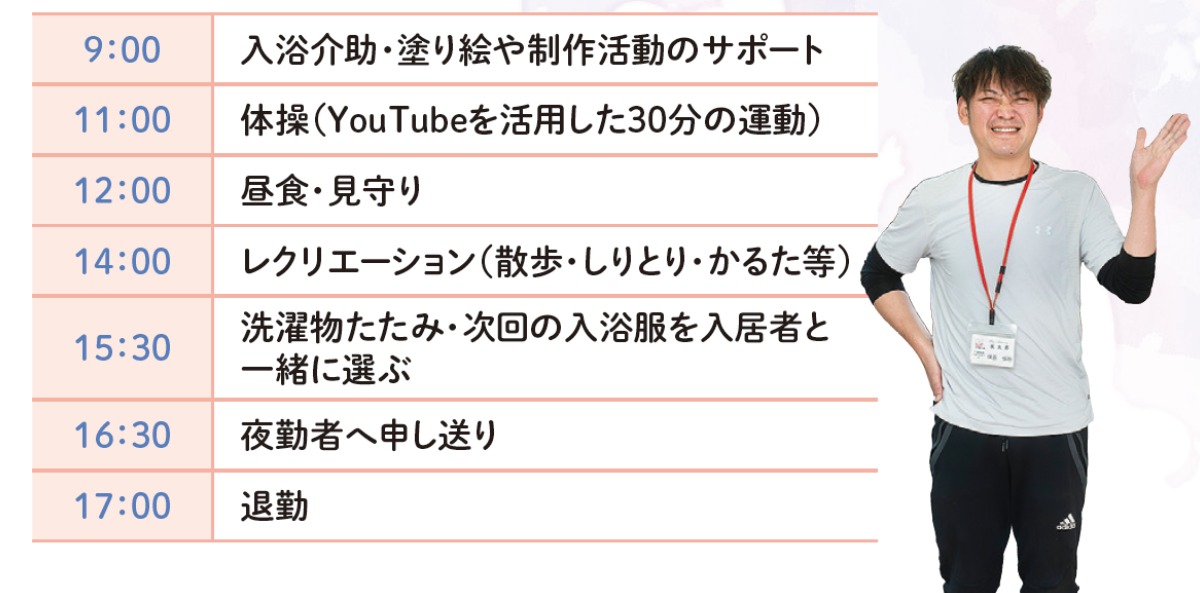 入浴や家事、体操、外出支援の中で入居者と関わる時間も十分に確保でき、ケアに集中できる。