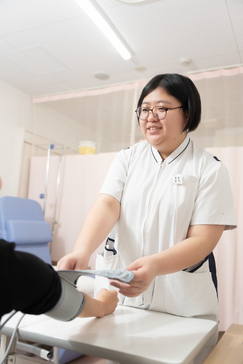 実習で感じた“一対一の深い関わり”に魅力を感じ、この道へ進む。患者の生活背景に寄り添いながら、丁寧な看護を目指す。