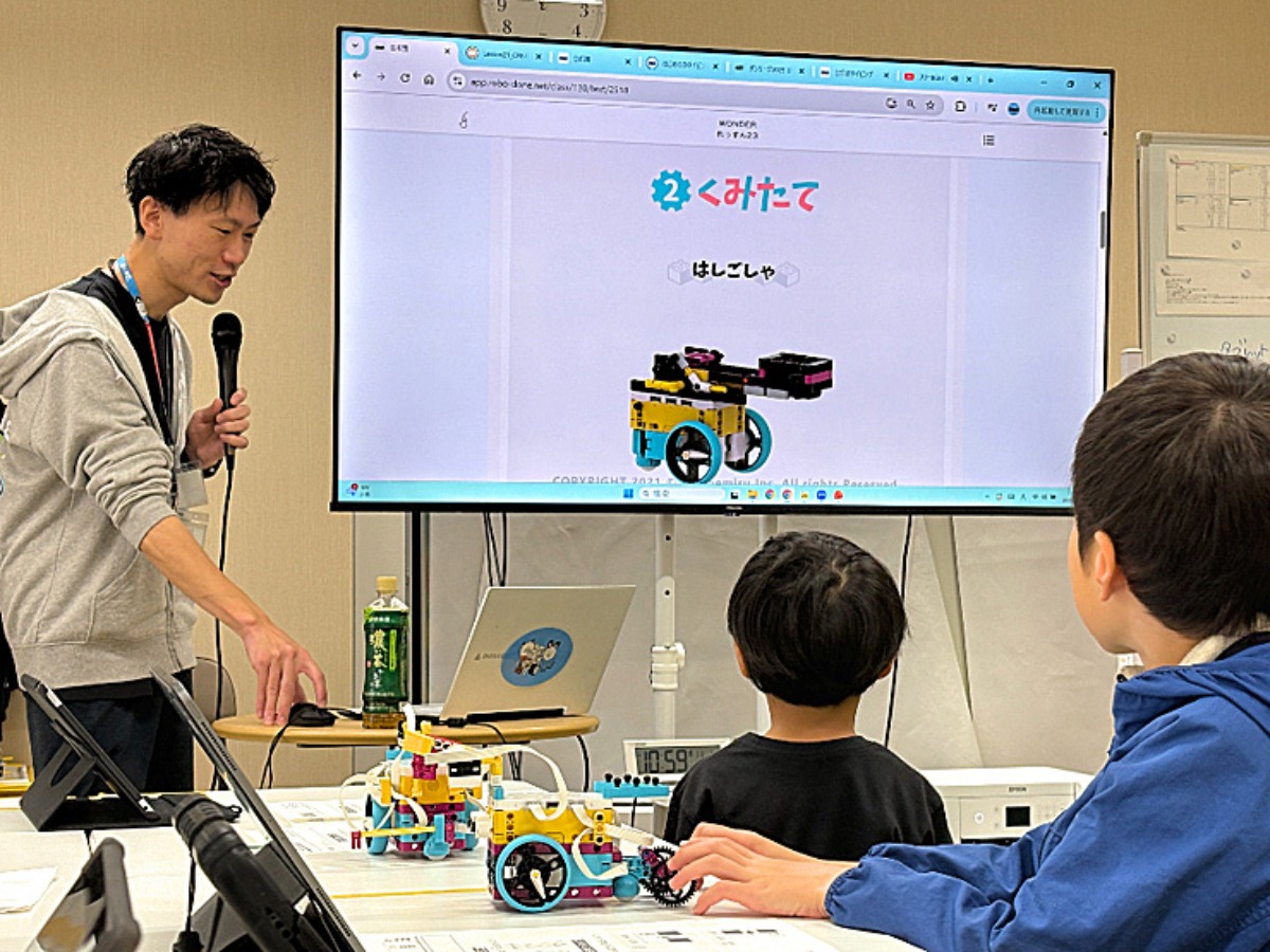 子どもたちが自分でロボットを組み立てて、プログラミングで動かします。
