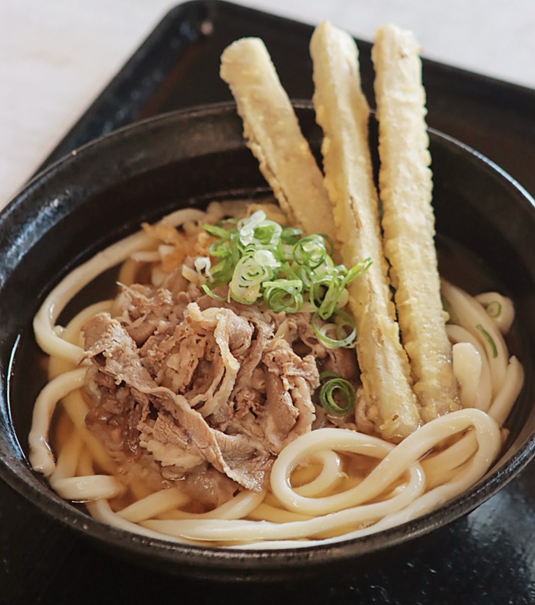 毎朝打ち立て、切り立て、茹でたてのもっちり麺に、甘めに炊いた牛肉をたっぷりのせ、さらにサクサクのごぼう天が3本ドーンと乗った贅沢な「肉ごぼう天うどん」(790円)。