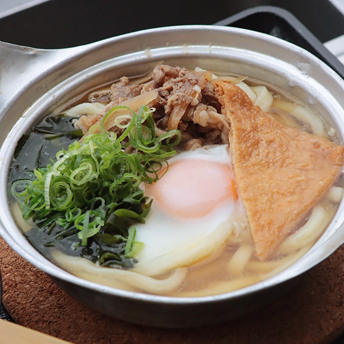 アルミ鍋でぐつぐつ煮込まれた熱々のうどんは、甘く味付けされた肉、きつね、わかめ、そして半熟卵が一体となったほっとする味わい。