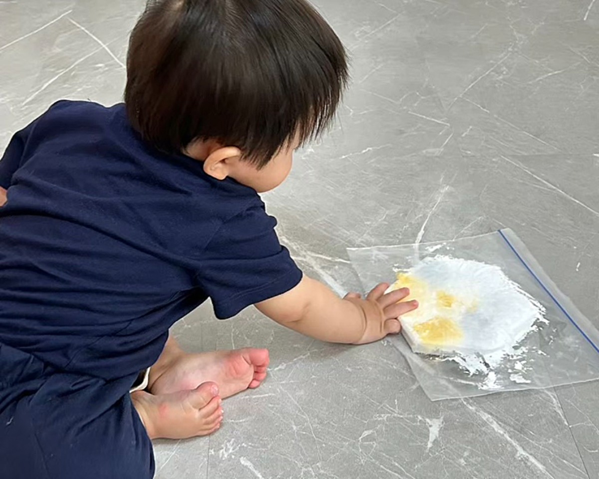 キャンバスに絵の具をのせ、ジップロックに入れて、ぺたぺたと触りながらアートを作ります♪