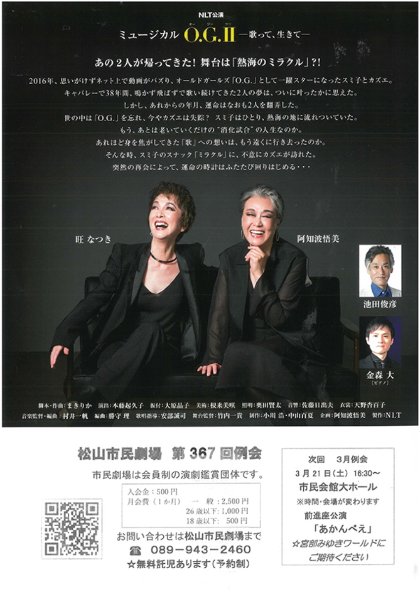 新宿・歌舞伎町の場末のキャバレーから一躍スターへの夢をかなえる2人のシンガー、スミ子とカズエが熱演した2人だけのミュージカル『O.G.』。