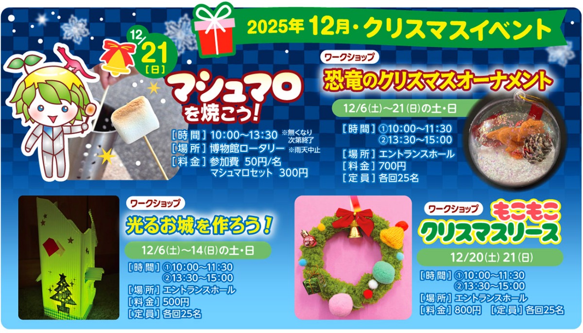 県総合科学博物館では、12月6日~2026年1月12日までクリスマスやお正月にちなんだ楽しいイベントやワークショップが催されます。