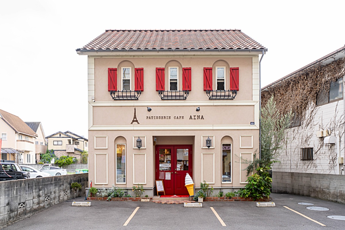 PATISSERIE CAFE AINA(パティスリーカフェアイナ)は、パリにあるパティスリーのようなおしゃれな外観が目を惹くお店。