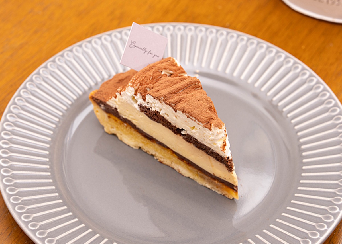 エスプレッソリキュールを染み込ませたティラミスとタルト生地を組み合わせた、大人味のケーキ。お酒とのペアリングも◎