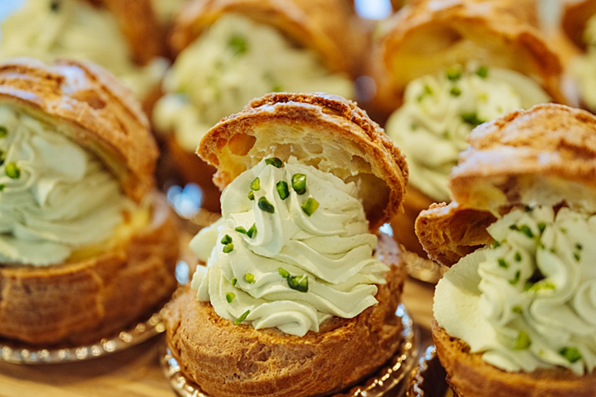 サクサクのシュー生地に、ピスタチオペーストとカスタードクリームをたっぷり詰めた看板スイーツ