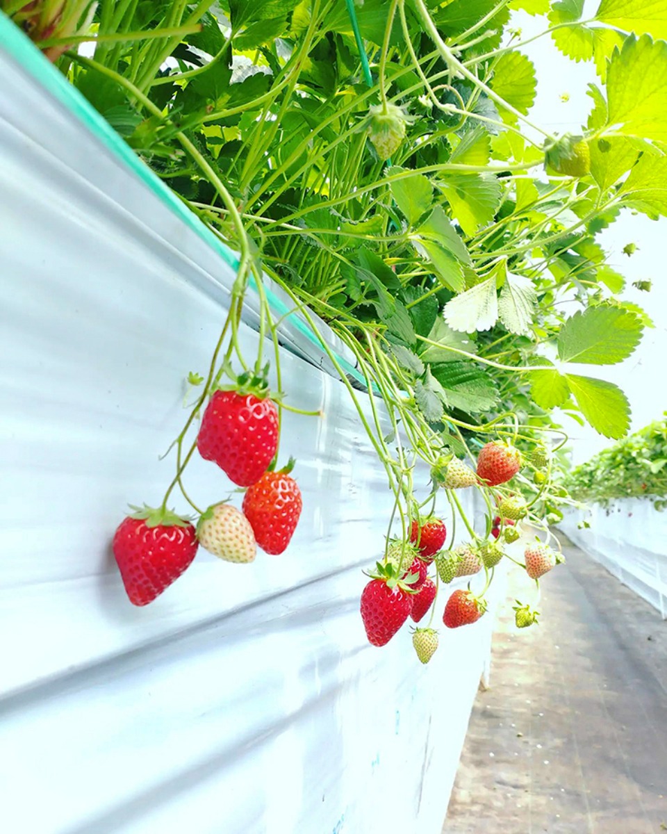 高設栽培は子どもの目線にもぴったりなので、お子さんも自分で収穫する体験ができますが、小さいお子さんと一緒の時は注意が必要です。興味本位で、未成熟ないちごを遊び感覚でどんどんちぎったりしてしまうので、必ず保護者の方が一緒にいて、いちごを傷付けないようにしましょう。