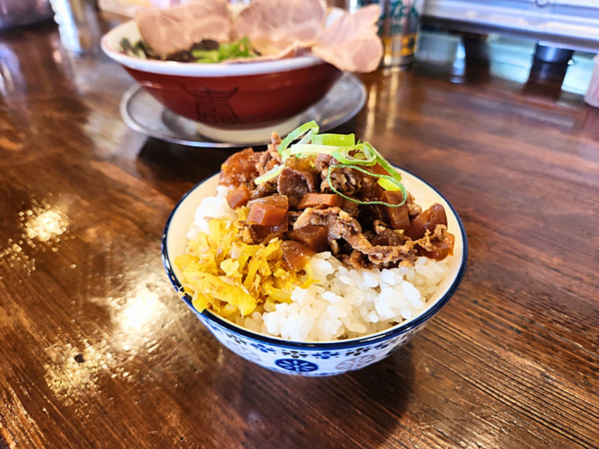 中にはチャーシューの端っこや、「きく鳥」で使用しなかった人参や玉ねぎを甘辛く煮たのがたっぷり。