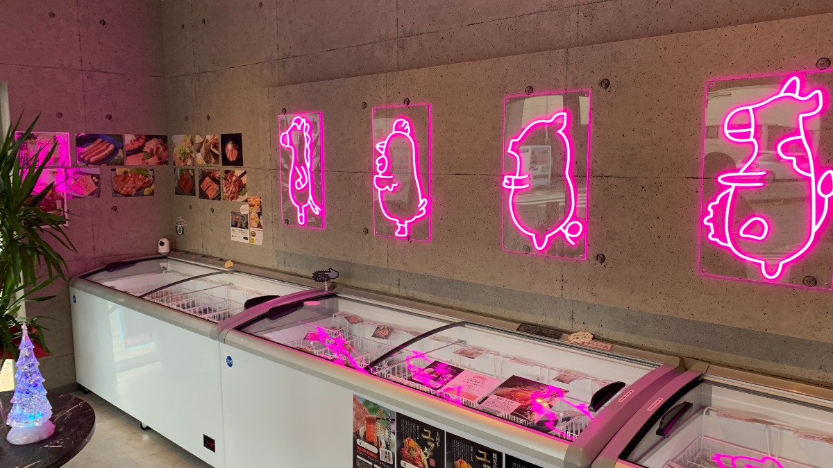 壁には、可愛い動物たちのピンクのネオン!! 誰か!! 前ならえして綺麗に整列しているこの動物たちに、これから食べられることを早く教えてあげてっ!!(笑)