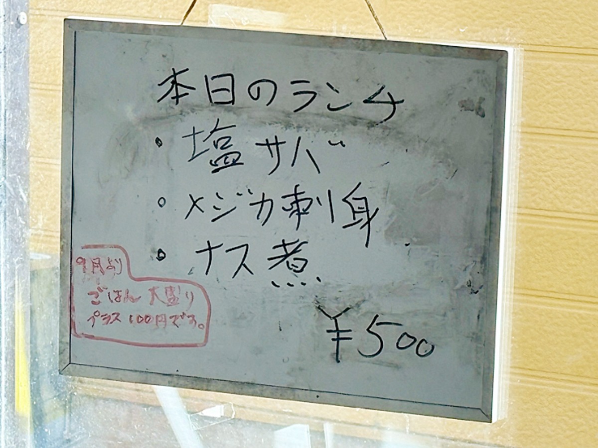 この日の日替わりは塩サバ・メジカ刺身・ナス煮。