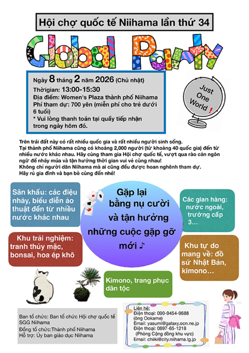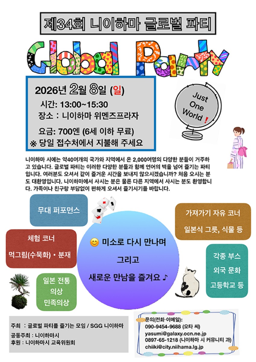 お問い合わせ/グローバルパーティーを楽しもう会(大亀) 090-9454-9688、新居浜市地域コミュニティ課 0897-65-1218