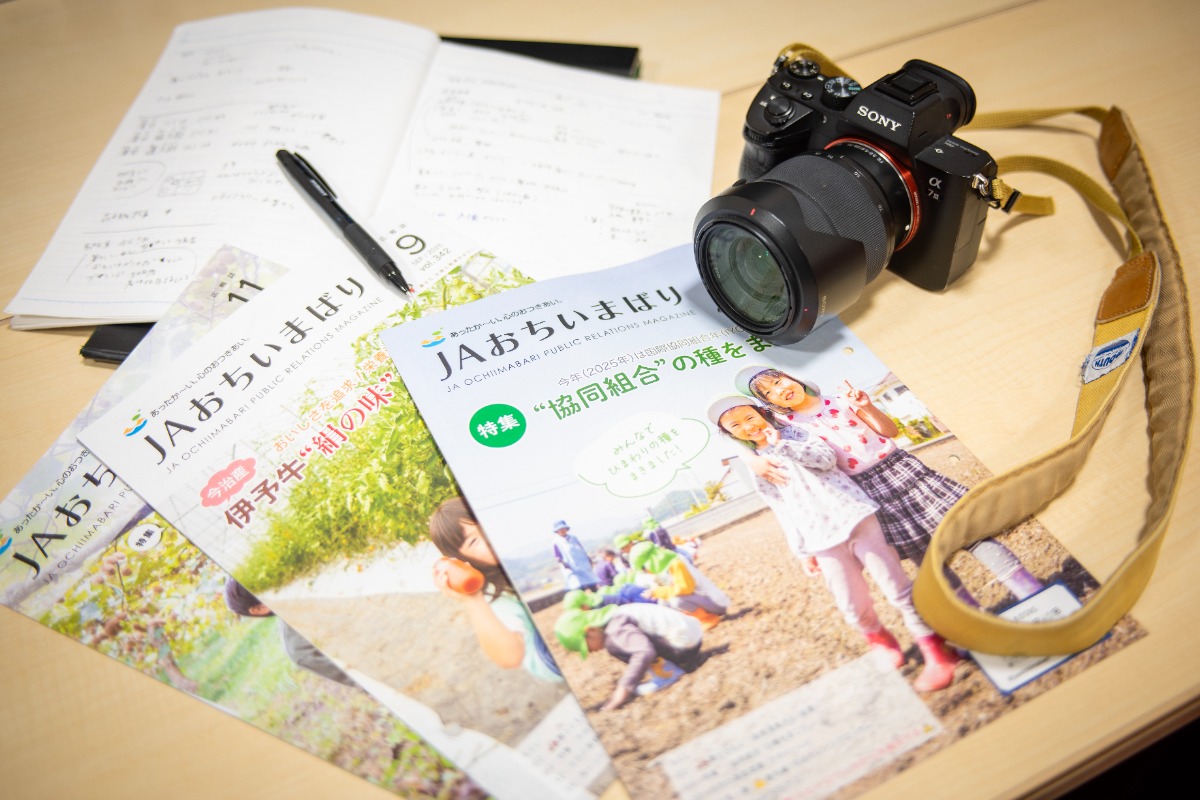 表紙用の写真も撮影しているカメラと取材ノート。広報誌は「さいさいきて屋」でも配布、WEBでも閲覧できます。