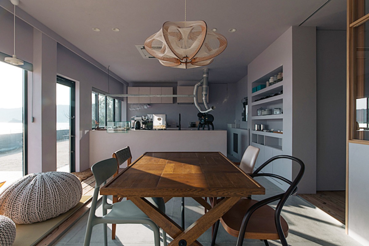 大きな窓からは、島々が織りなす風景が広がり、晴れた日の澄んだ青い海、霧に包まれた幻想的な雨の日、夕日に染まる黄昏時など、刻一刻と変化する表情を楽しめます。