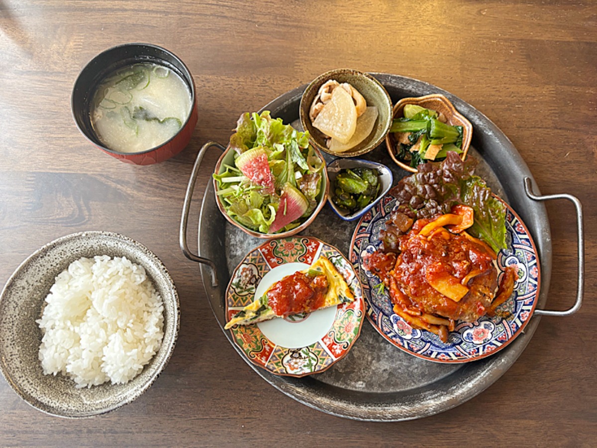 月替わりメイン、気まぐれ小鉢3種、お味噌汁、漬物、白ご飯のセットになります。