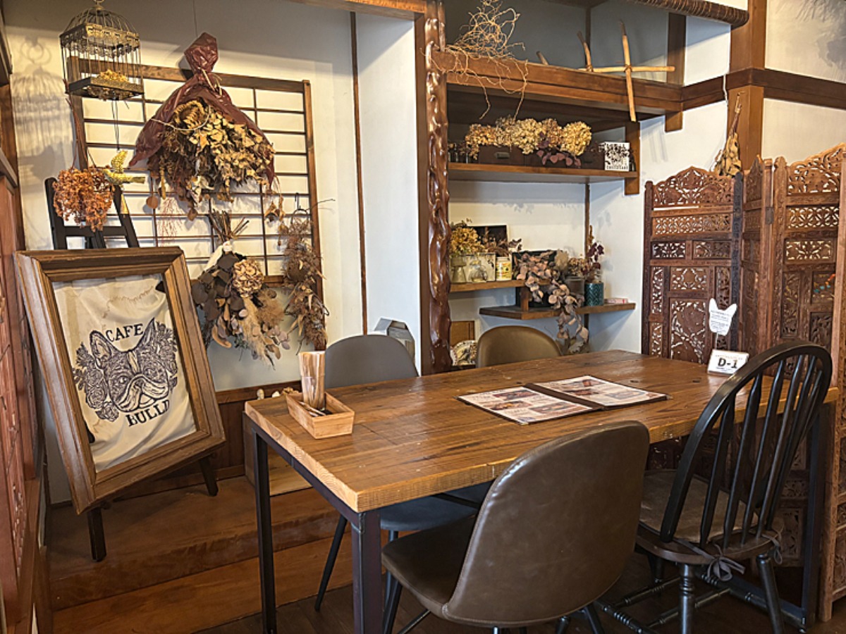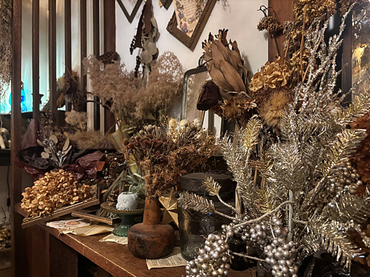 店内にはアンティークな家具やドライフラワー、可愛らしい雑貨が並びます。