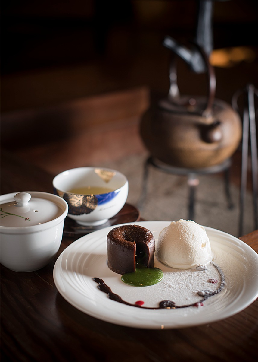 ケーキの中には新宮茶を使った、 香り豊かなチョコレートが。バニラアイスを添えて召し上がれ