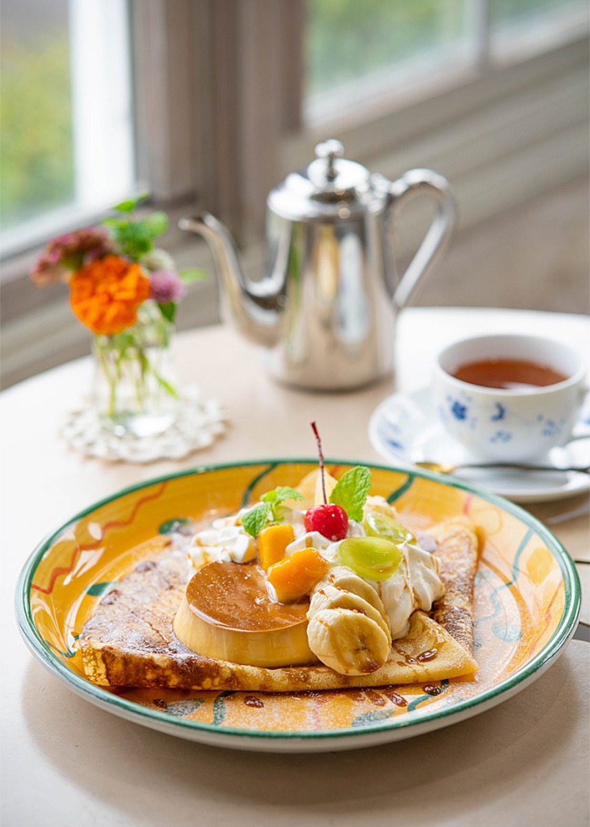自家製プリンをクレープにオン。生クリームや季節のフルーツと小さなクレープを作って召し上がれ