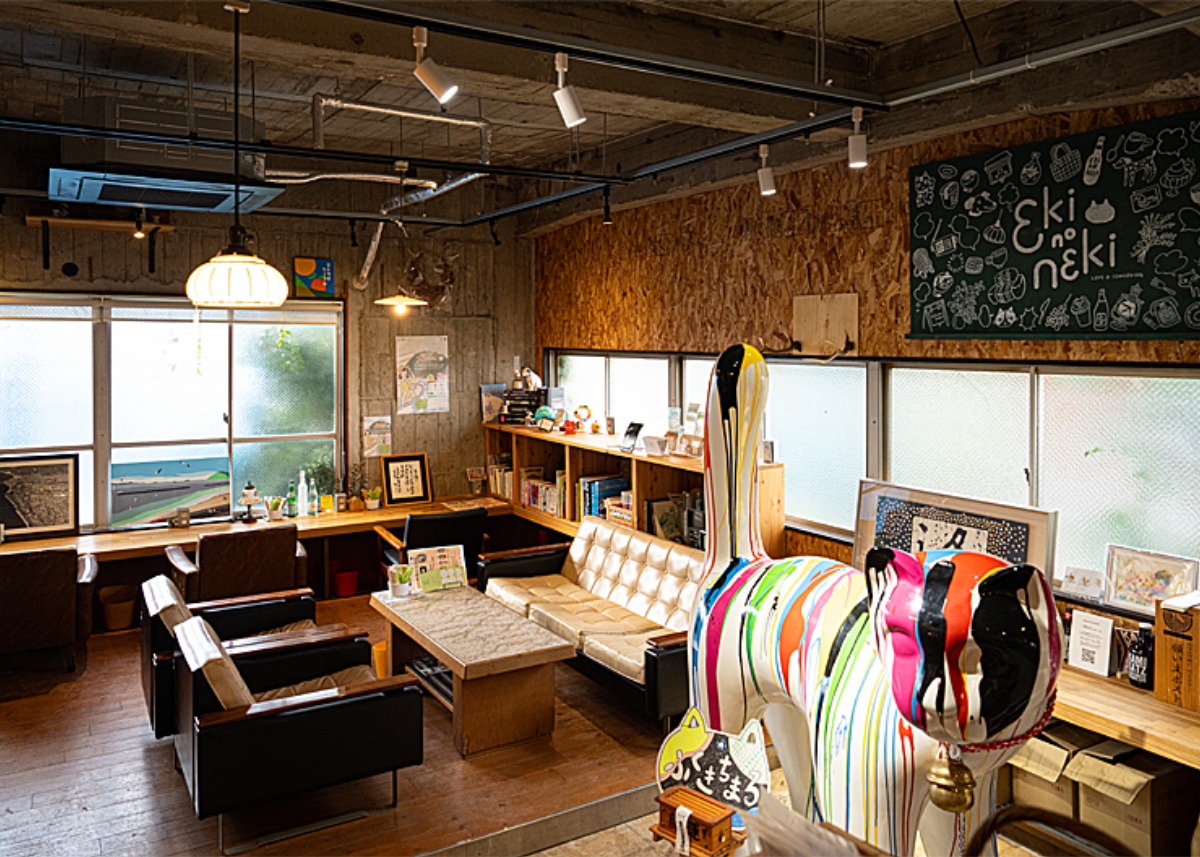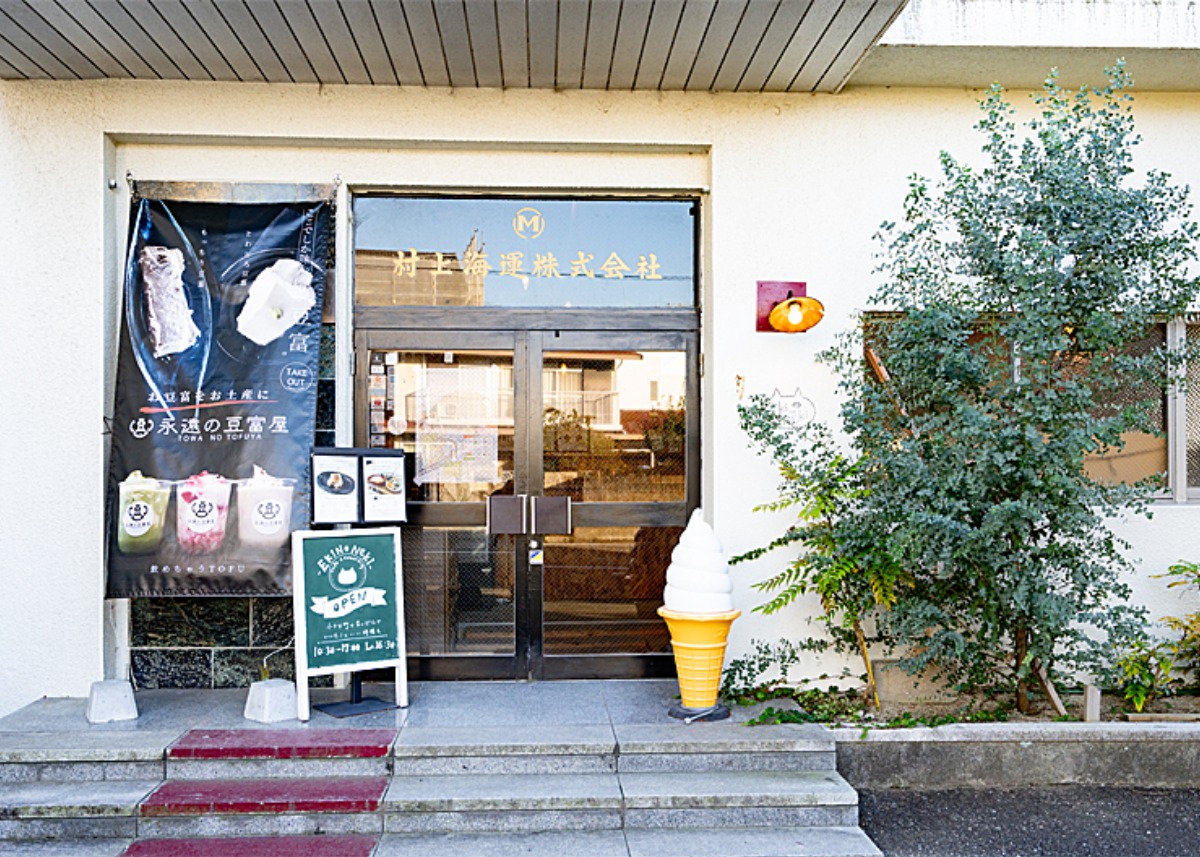 JR「伊予北条駅」の近く、元海運会社だったビルをリノベーションしたカフェ「エキノネキ」。