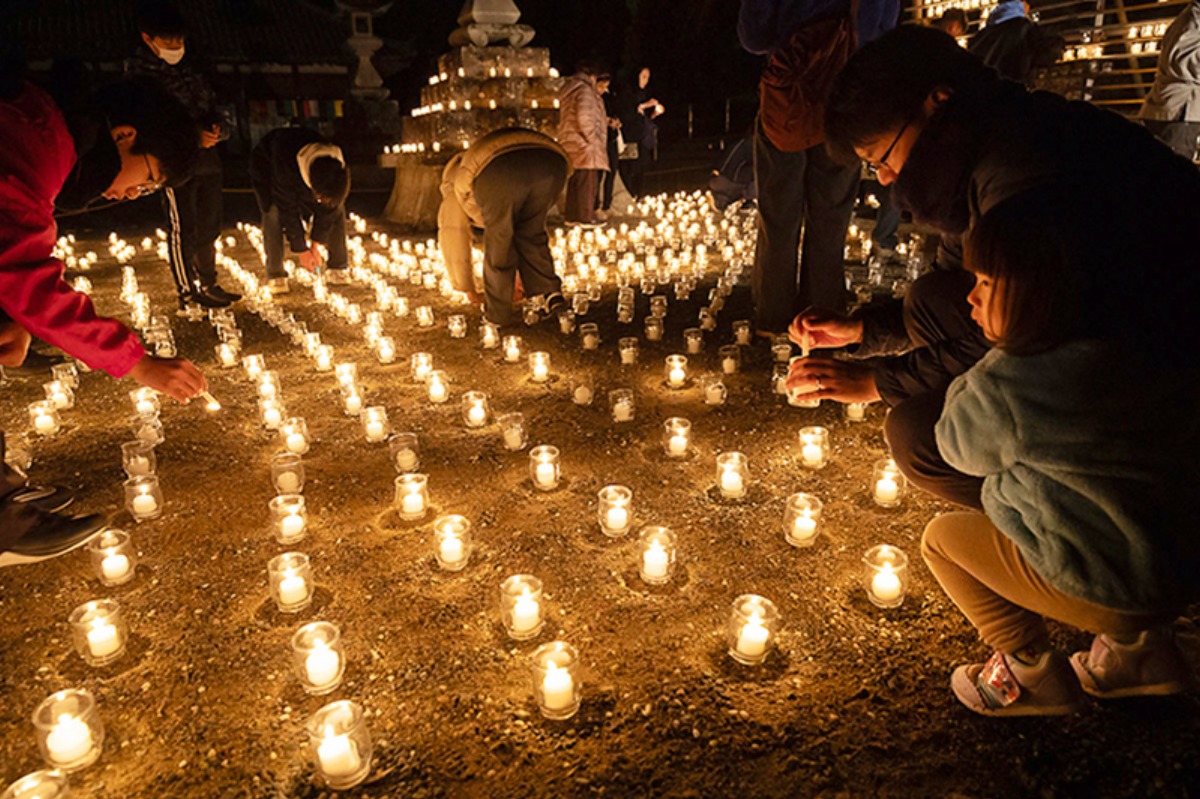 大晦日23時からは「世界平和万灯会」が開催され、境内に並ぶ無数のろうそくが幻想的な雰囲気を作り出します。