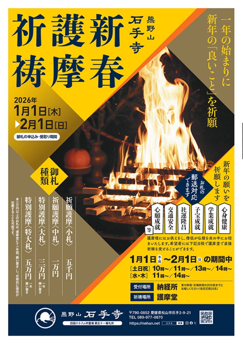 松山市の石手寺で開催される新春護摩祈祷は、心静かに新年を迎えたい方にぴったりの初詣イベントです。